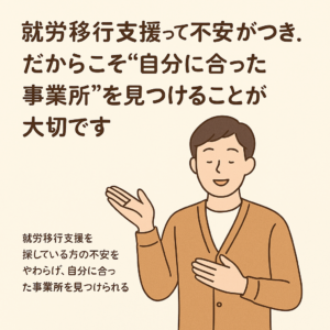 “環境が⼈を作る”という考えのもと、利⽤者様がリラックスして就職に向けた訓練に取り組めるように、雰囲気・環境作りを⼤事にしています。