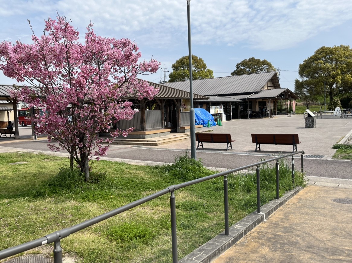 足湯と物産館なのですが、手前の梅も合わせて撮りたくて引き気味に撮影しました👀