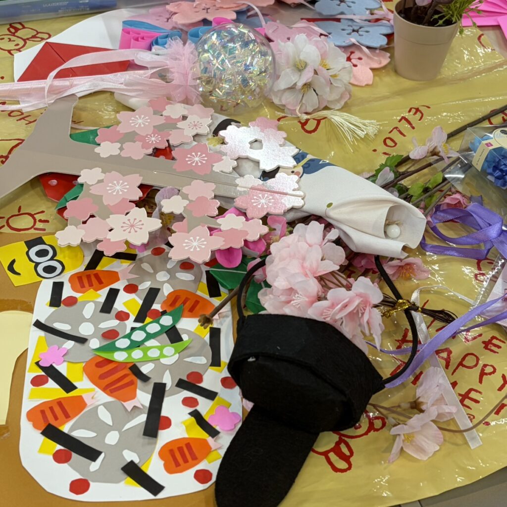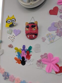 今回は、折り紙や画用紙を使ってハートのモチーフを作ったり、少し時期は過ぎましたが節分の鬼の飾りも制作しました。利用者の皆さんと一緒に色とりどりの作品を仕上げ、事業所内が一気に華やかな雰囲気になりました。