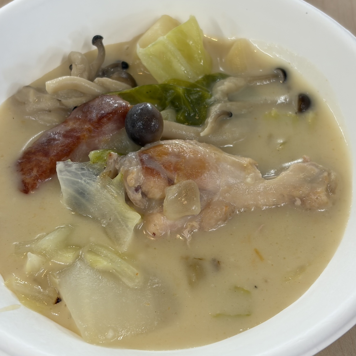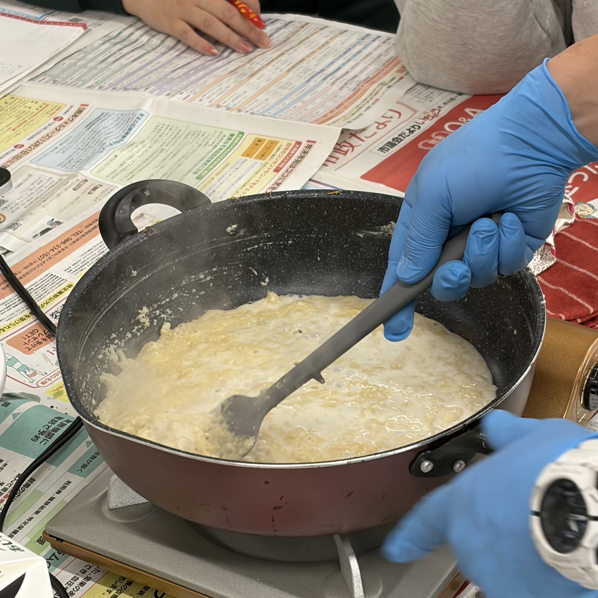 市販のルーを使わず、牛乳から丁寧に仕上げるシチューは、鍋の中で素材の旨味が重なっていく様子が見ているだけで幸せになる一品。骨付き肉から出るだしの香りに、利用者さんから思わず「おいしそう…」という声が漏れていました。