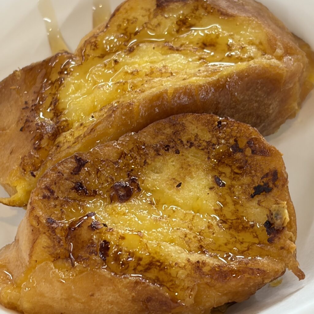 フレンチトーストは、バケットにしっかり焼き目をつけながら仕上げていくスタイル。シェフの手元の動きは無駄がなく、焼き色のつき方ひとつにもプロのこだわりが感じられます。