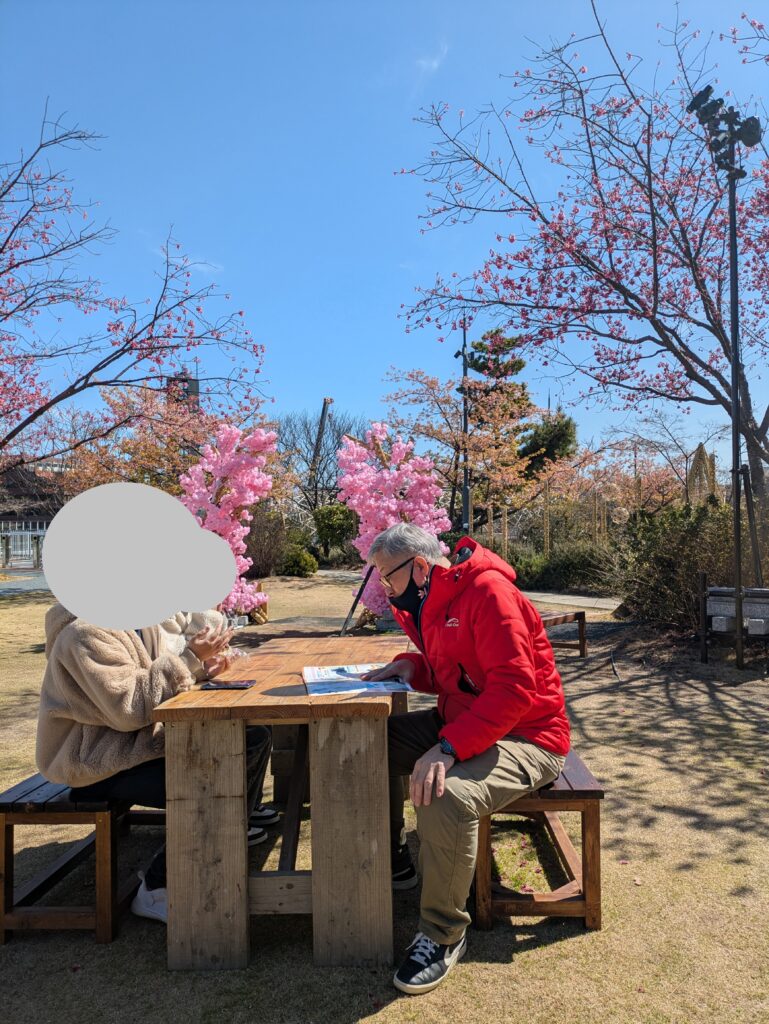 この日はウォーキングを兼ねて、利用者さんと一緒に早咲きの桜を探しながら、誕生祭の様子を見に行くことにしました。会場にはたくさんの来場者が集まり、遠目ではありましたが、生のくまモンを見ることができ、利用者さんも自然と表情がほころんでいました。