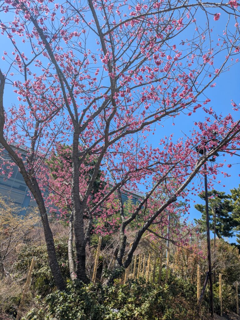 その後はサクラマチの外周まで足を伸ばし、花畑広場から見えていた桜の木へ。梅の木も咲いており、近づいてみると、ちょうど三分~五分咲きほどで、春の訪れを感じさせるピンクの色合いがとてもきれいでした。