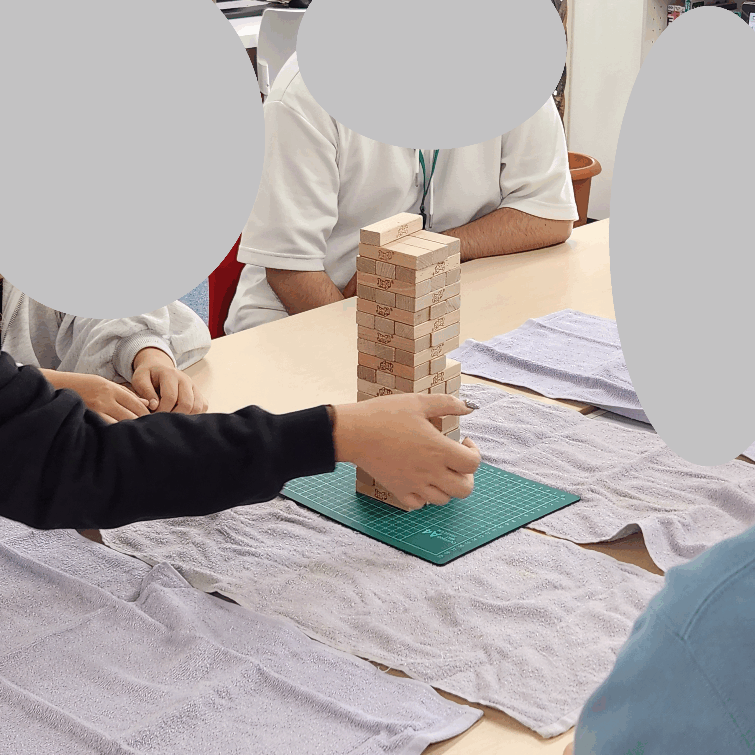 いつ倒れるか分からないジェンガのハラハラドキドキ感で、顔なじみのない利用者ともすぐに盛り上がれるプログラムとして、利用者のみなさんからも好評です。