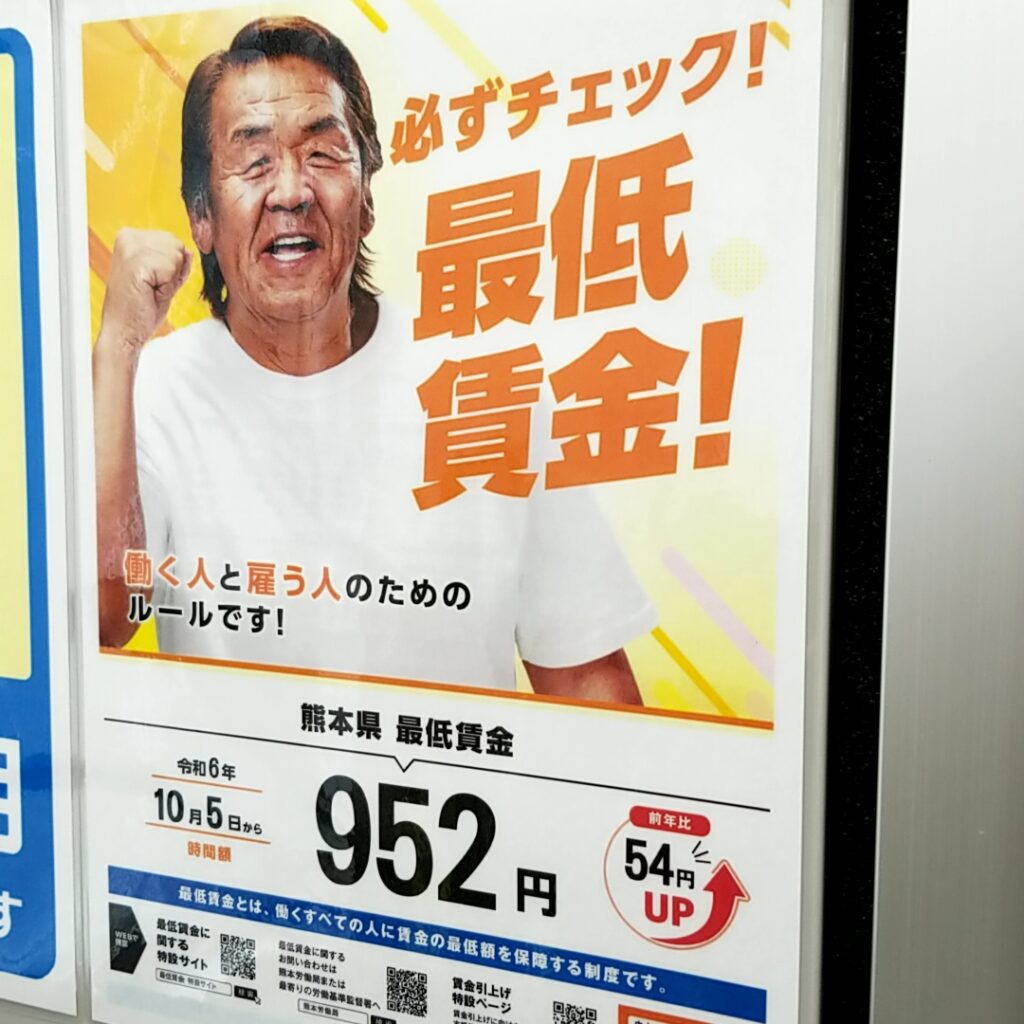 厚生労働省によると、令和8年1月1日から熊本県の場合、時間額952円 → 1,034円。82円の賃上げになるそうですよ♪