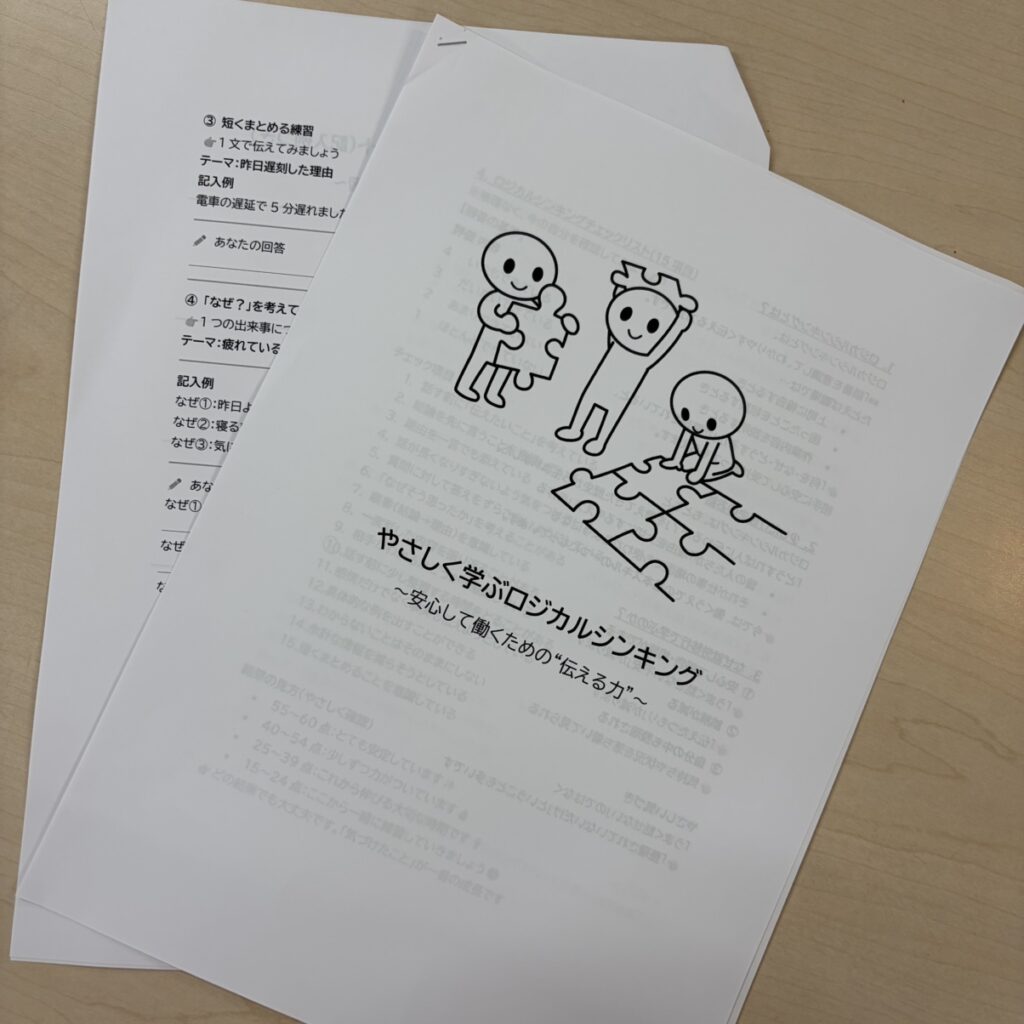 まずは「ロジカルシンキングとは何か」を、身近な例を交えて共有しましたよ。「筋道を立てて考えること」とシンプルに捉えることで、難しさよりも「使えそう」という実感につながった様子が見られました。利用者の方からは「自分なりの説明ができた」という声もあり、理解の第一歩を大切にする時間となりました。٩(。•ω•。)و