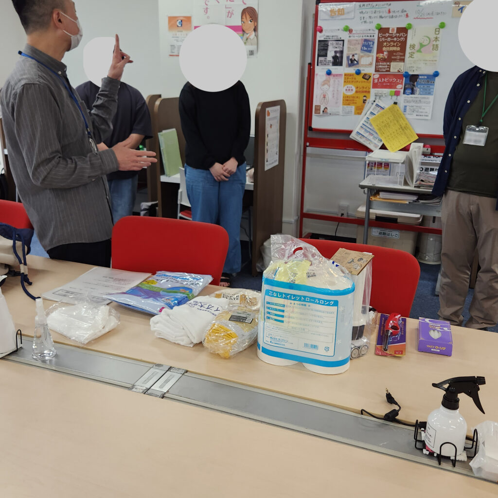 震災や、大雨、火災など考えられる災害に対して、避難経路や防災グッズの説明と確認、そして実際に避難場所へ移動して皆さんに体験してもらいました。